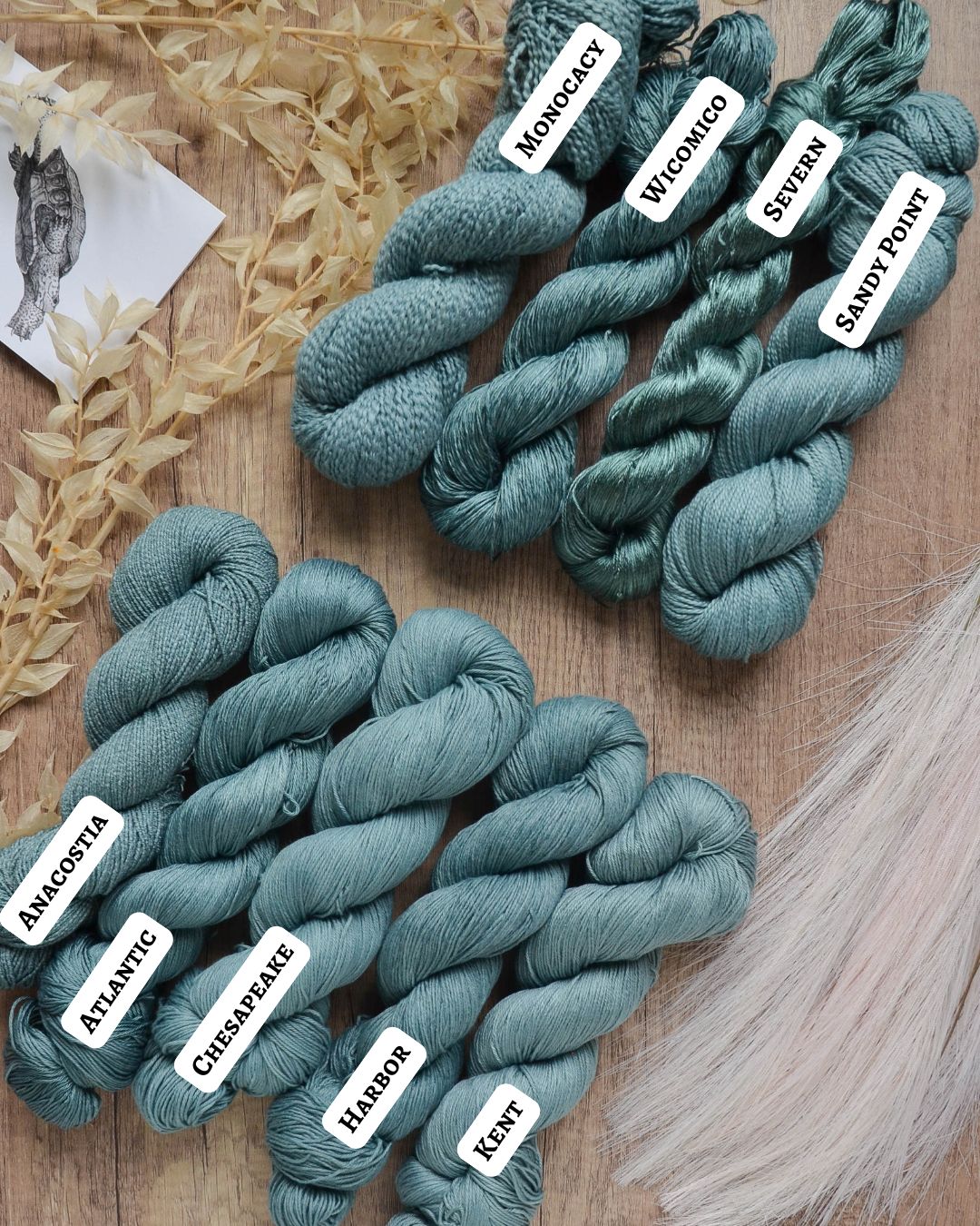 Estuary was originally a show special dusty teal inspired by the Chesapeake Bay for the 2023 Yarncentrick show. I've given it a bit of a refresh - it is a little greener and a little more saturated, but generally the same idea, only now you can get it on all the bases! This is one of my favorite beachy teals and I'm really happy to have it back!