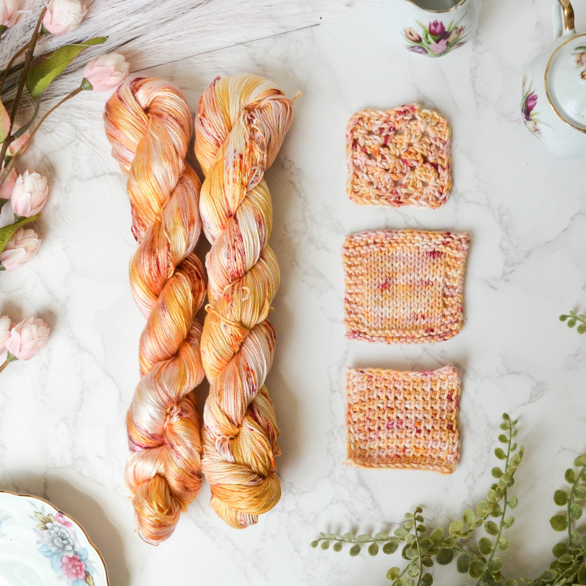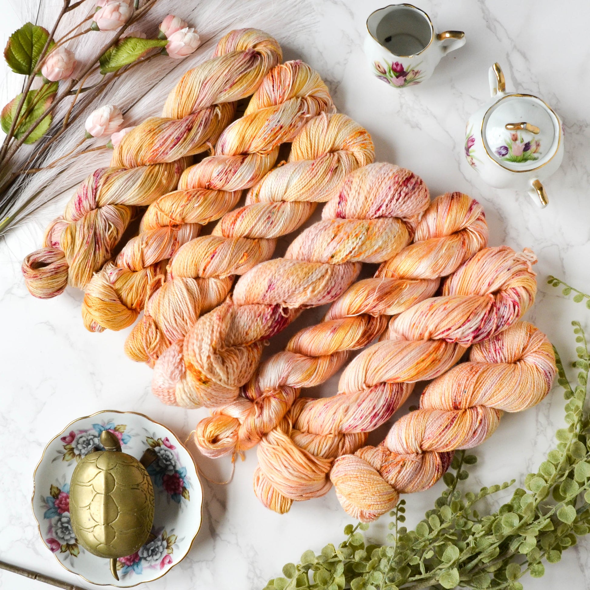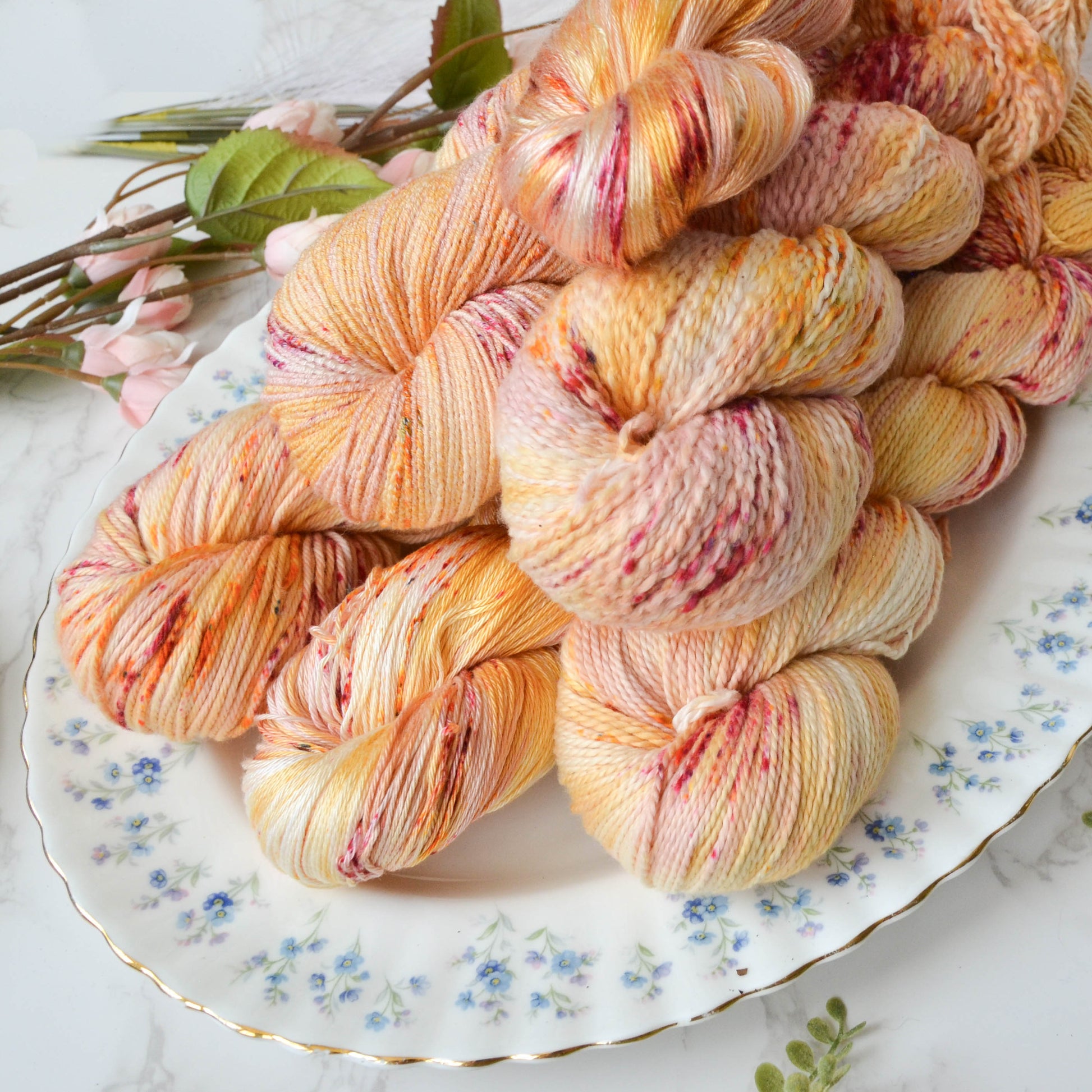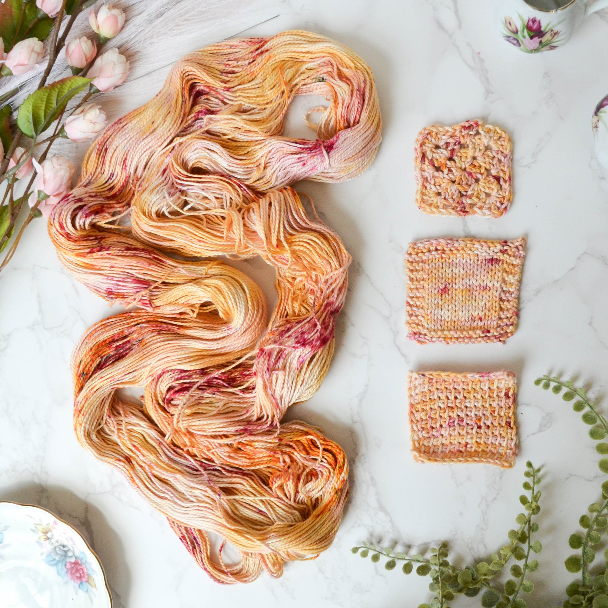 Our Steep Yarn Club August Color, Just Peachy, has a fruity-floral base of golden yellow and soft pink, topped with sunshine orange and deep hibiscus pink speckles. Imagine the way biting into a fresh peach feels!