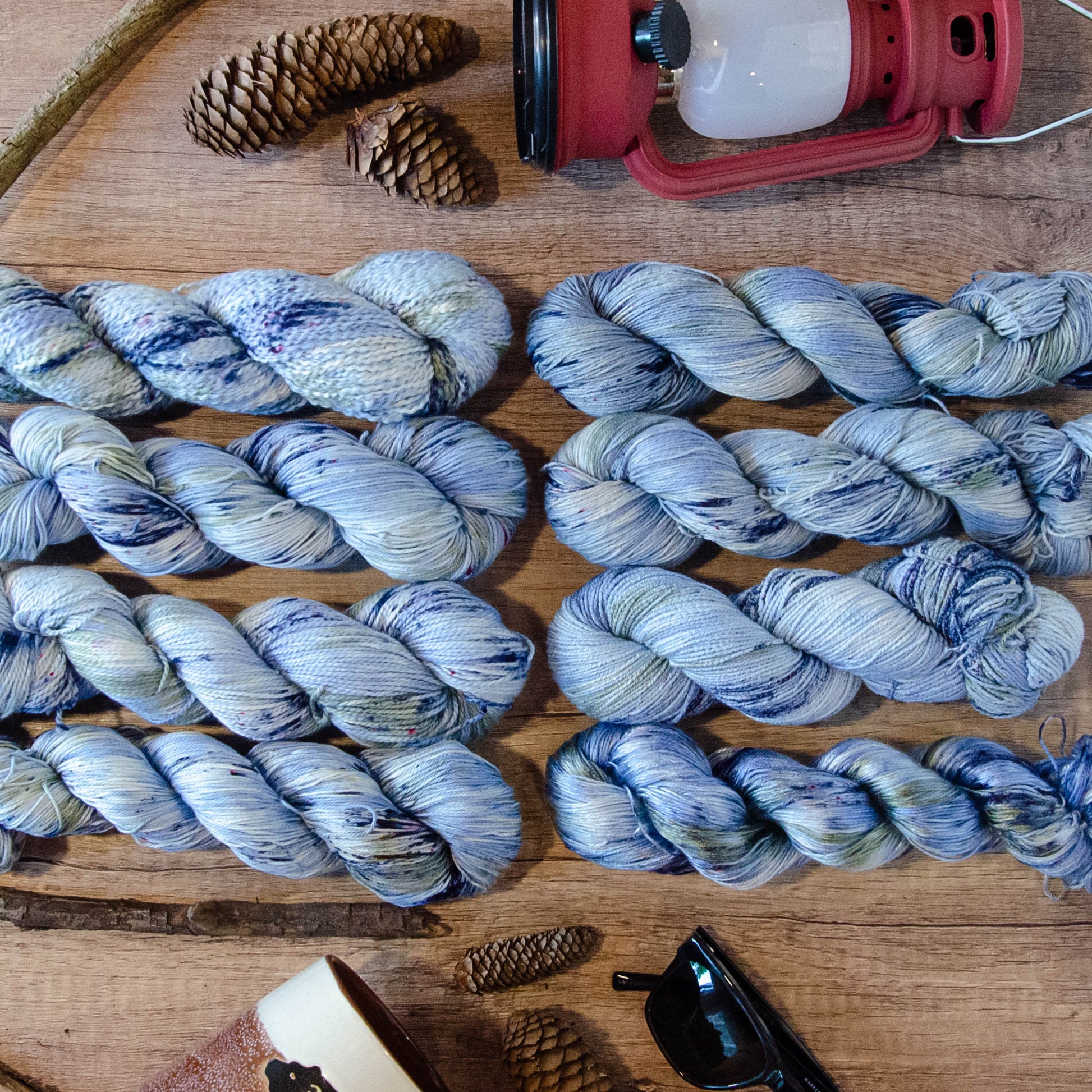 Midcoast is a cool, soft cornflower blue variegate shot through with touches of sage and dark, seawater-navy speckles.