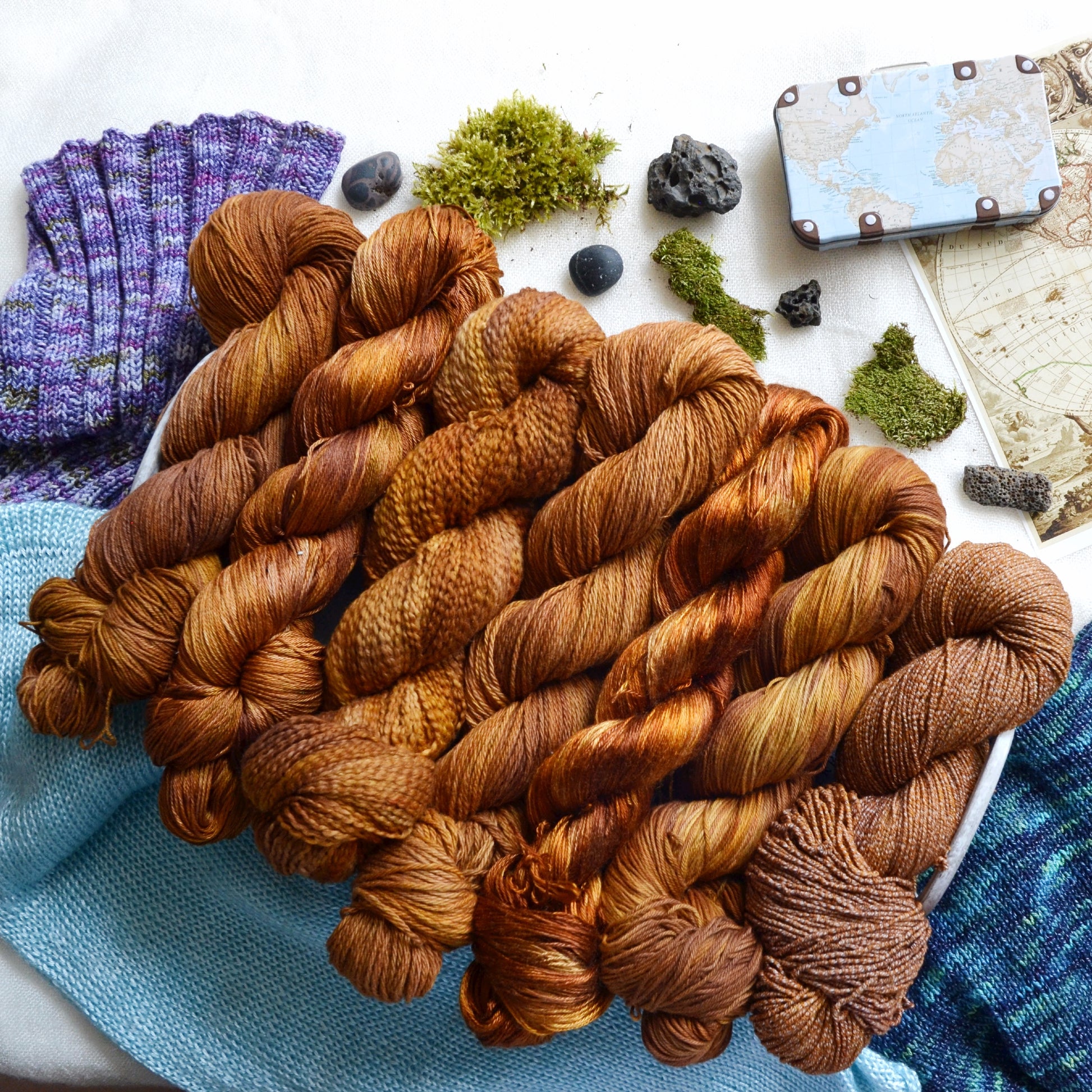 I was torn for a long time about whether I wanted to name this color after Icelandic horses, or the midnight sun. In the end, I decided the sun was more poetic, but feel free to take this color as an interpretation of both things! It is a soft golden brown variegate for fans of our Farmer’s Market colorway Honey; it pulls the richest golden oranges from that shade together with grounding deep browns for a complex, but not overwhelming warm neutral.