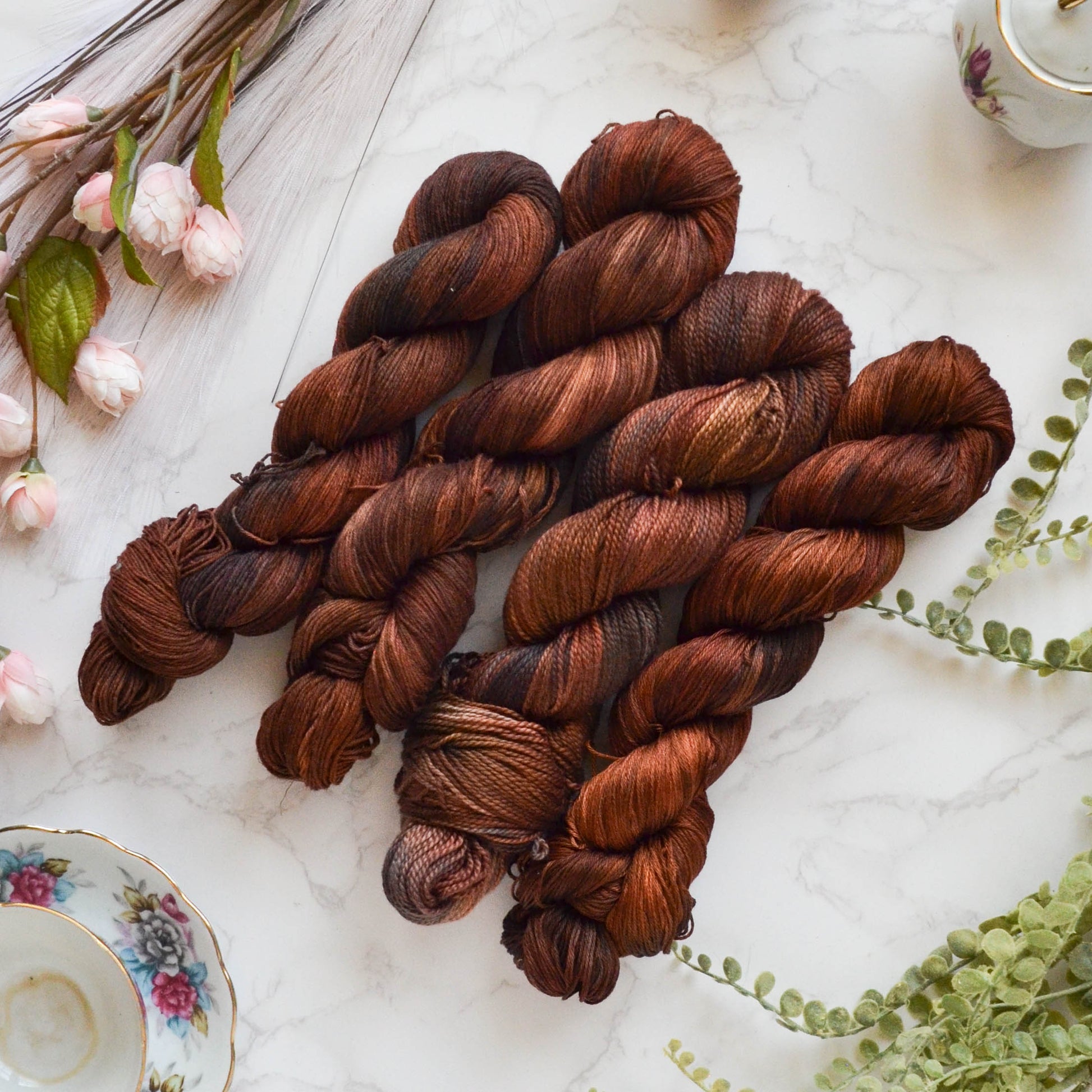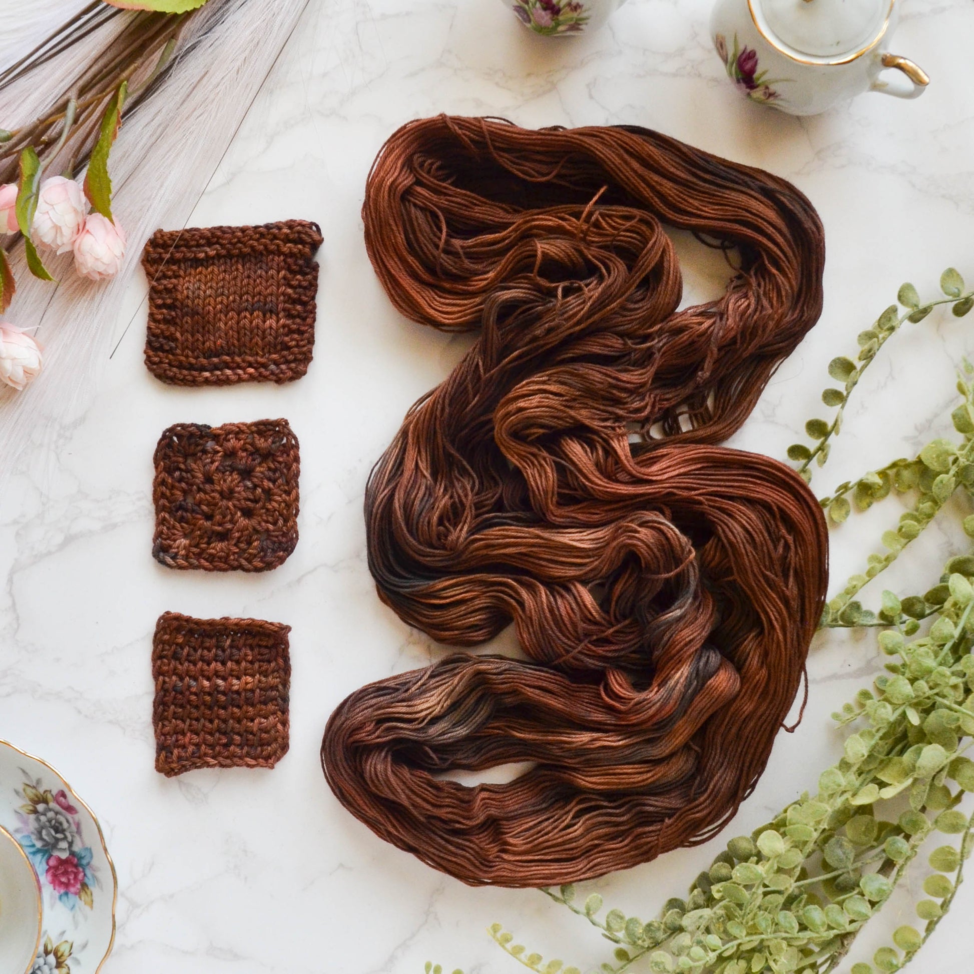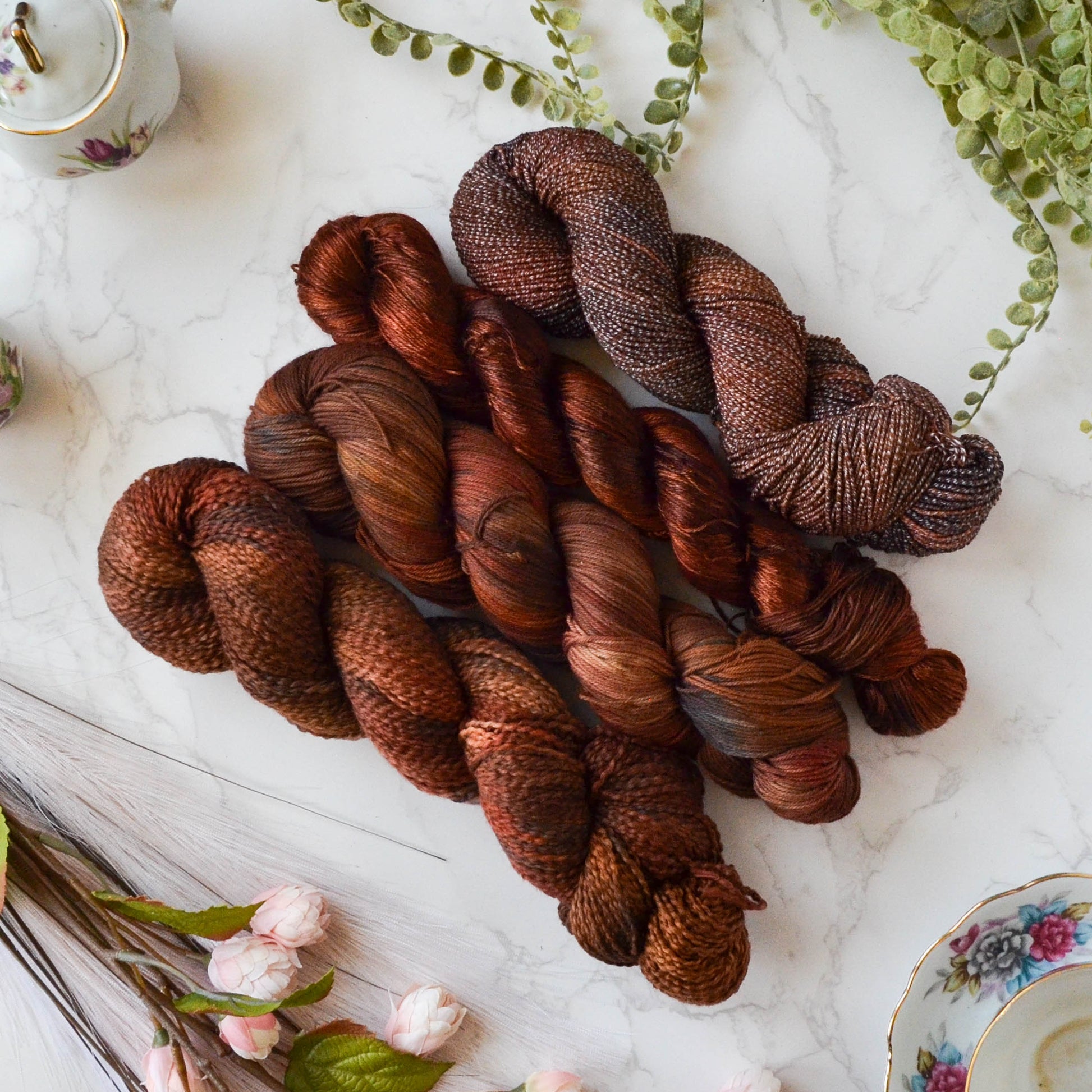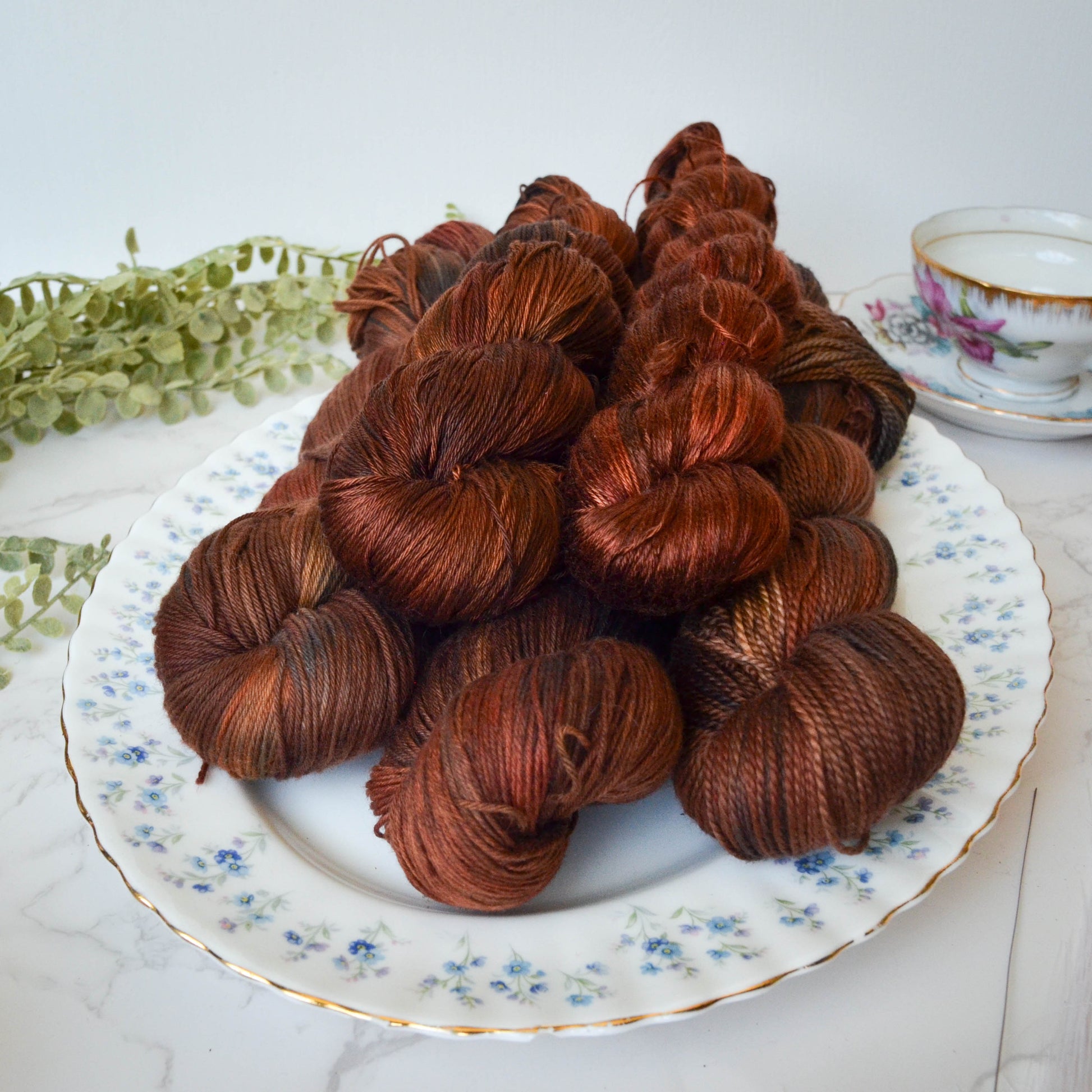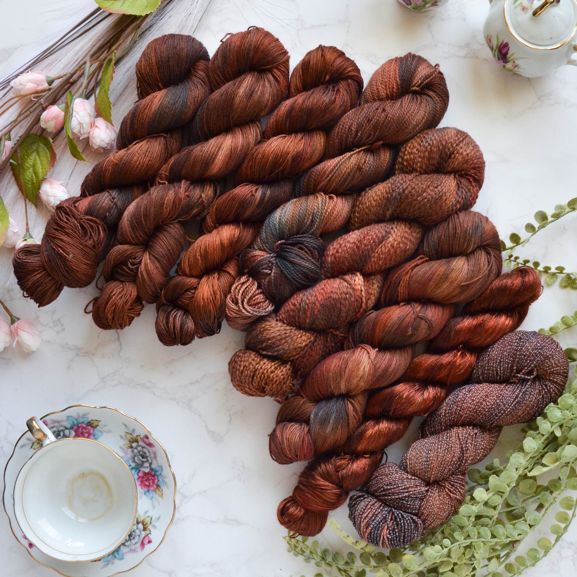 Our Steep Yarn Club November Color, Spiced, is a russet blend of spice jar browns, styled to mimic the ingredients of a rich chai!