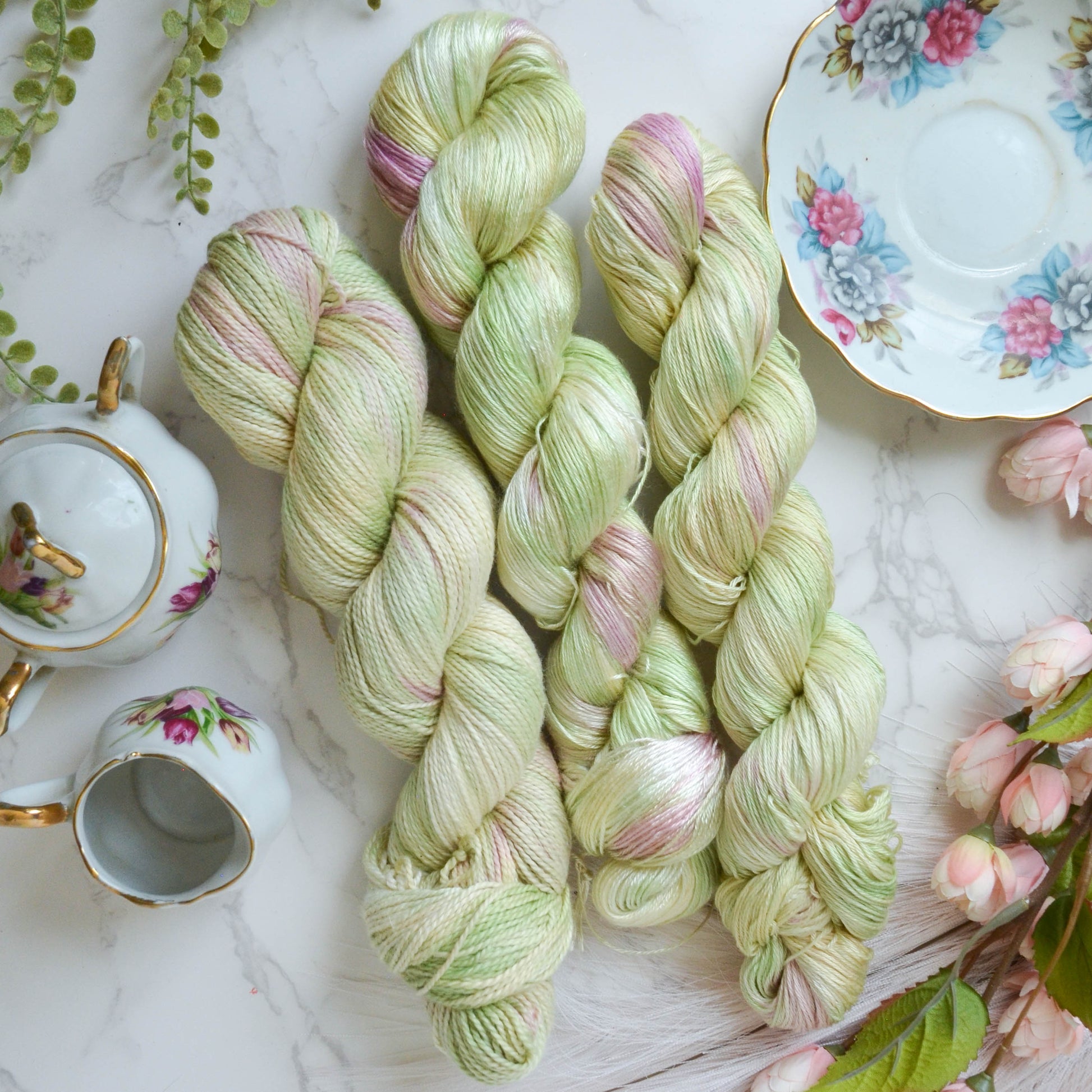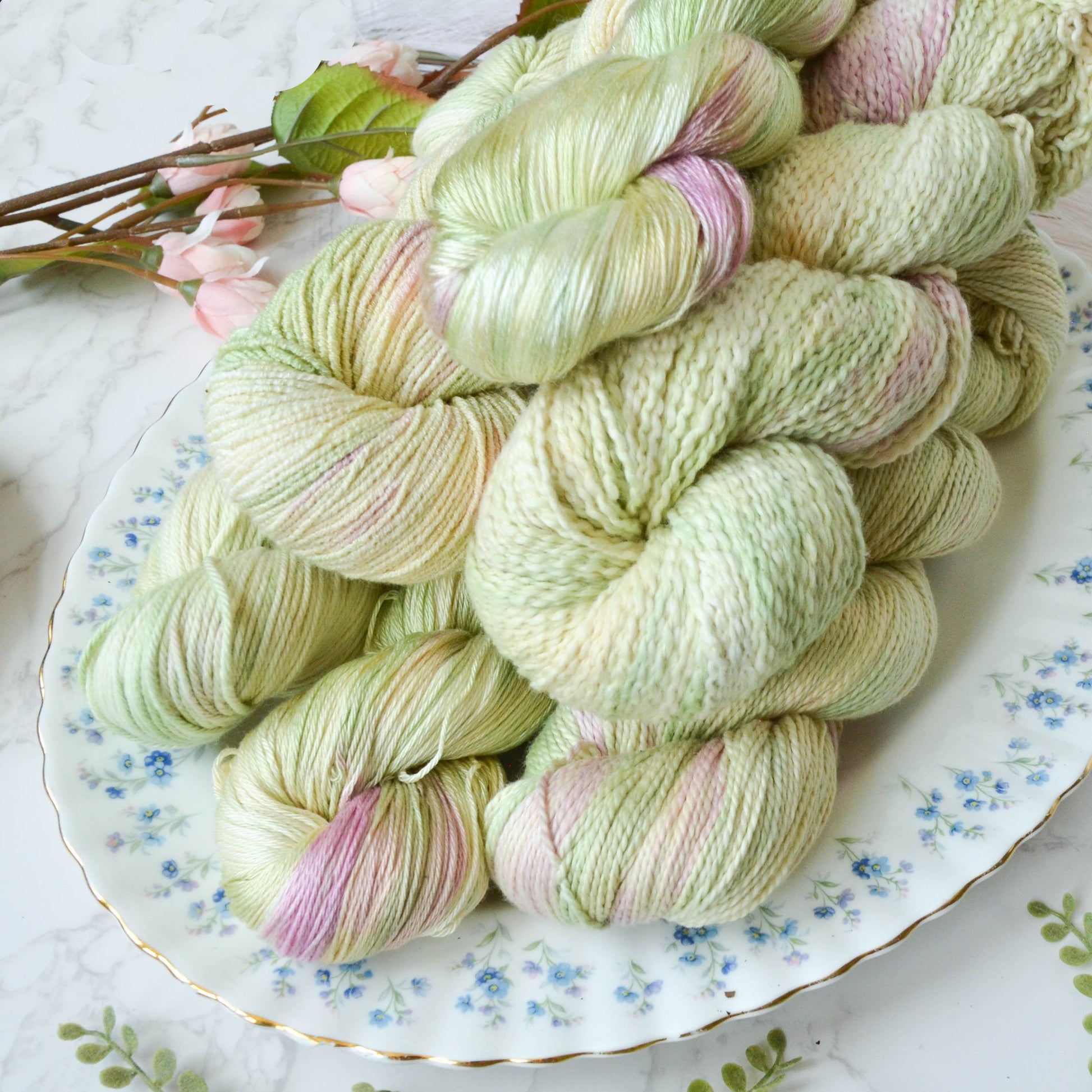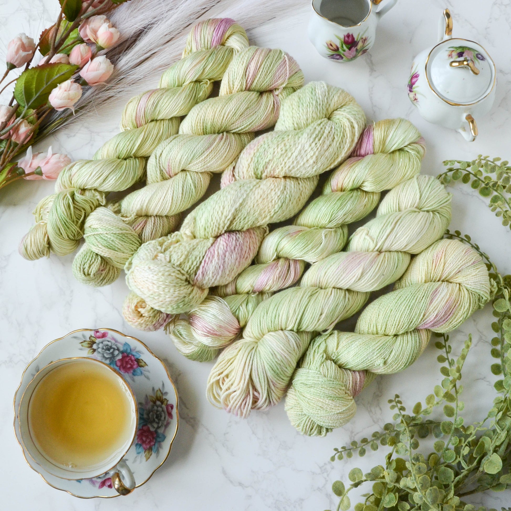 Our Steep Yarn Club July Color, Zesty, is a light and refreshing variegate with shifts of pale green and ivory topped off with a kiss of pink. The colors are inspired by lemongrass stems!
