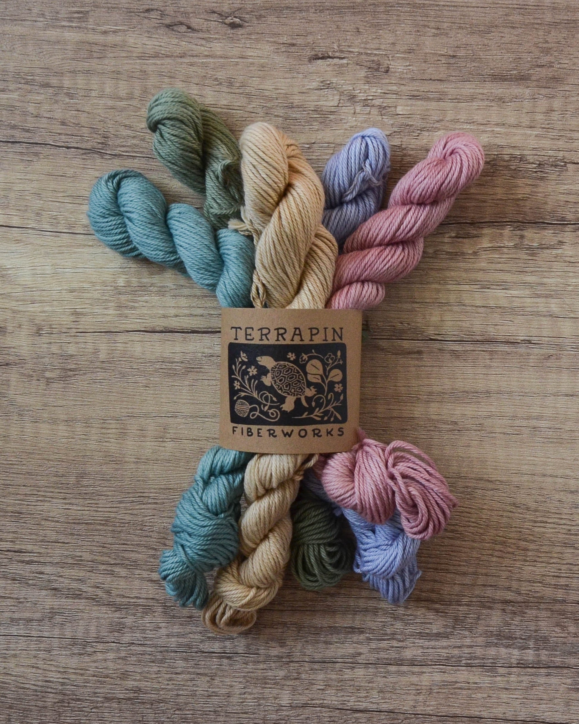 These are 100g sets of 5x20g skeins. The base is Chesapeake Organic Cotton DK, 246 yds/100g. Each mini is 49 yds/20g.