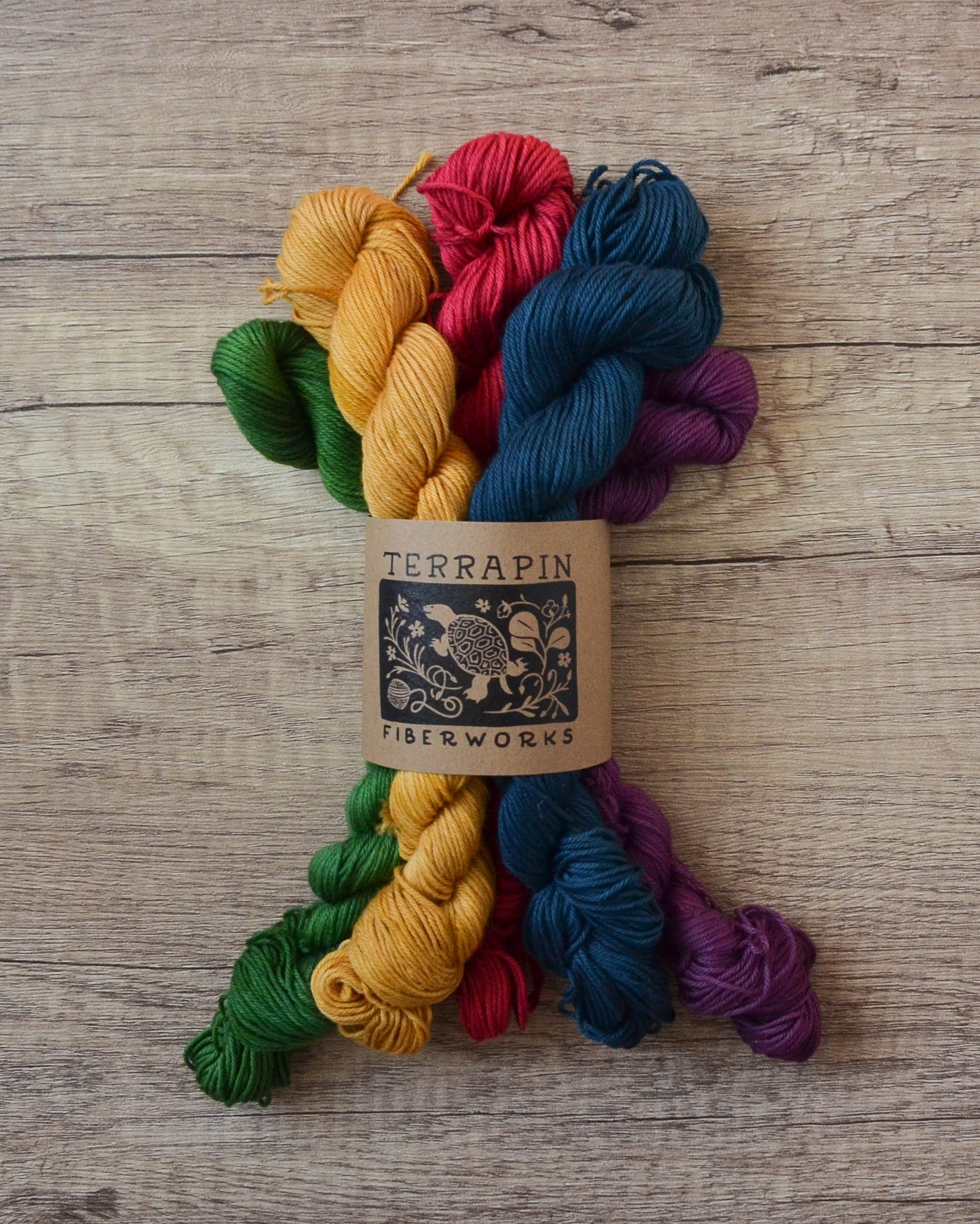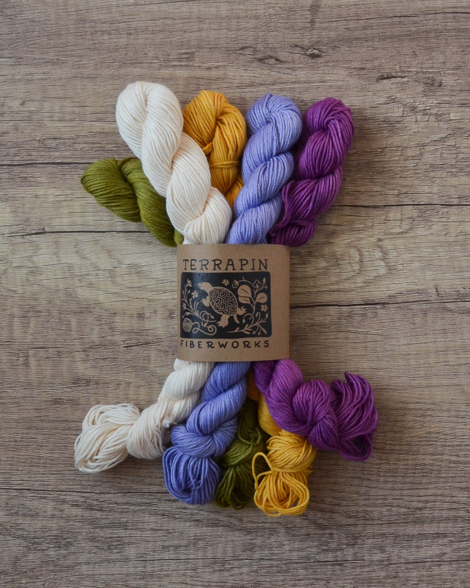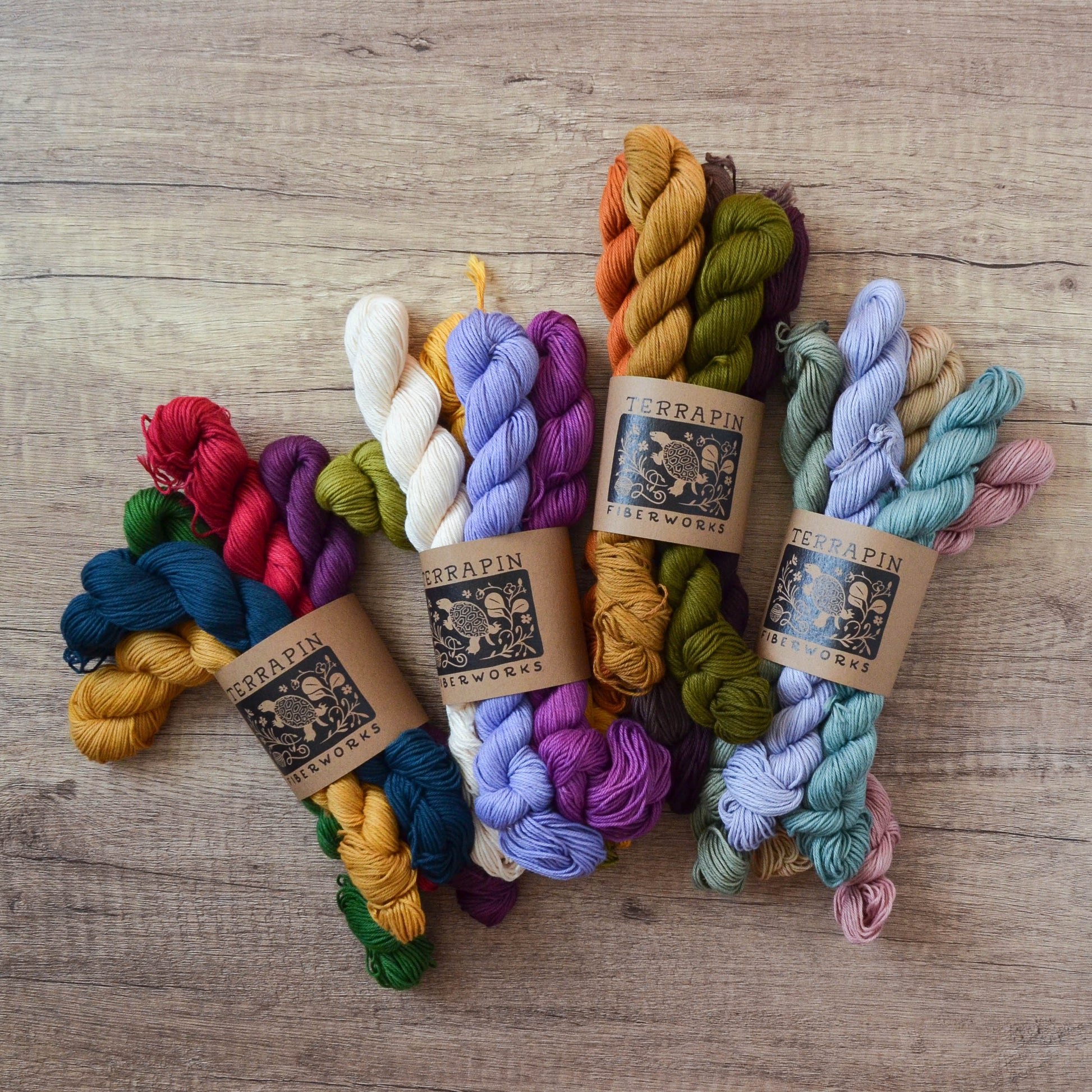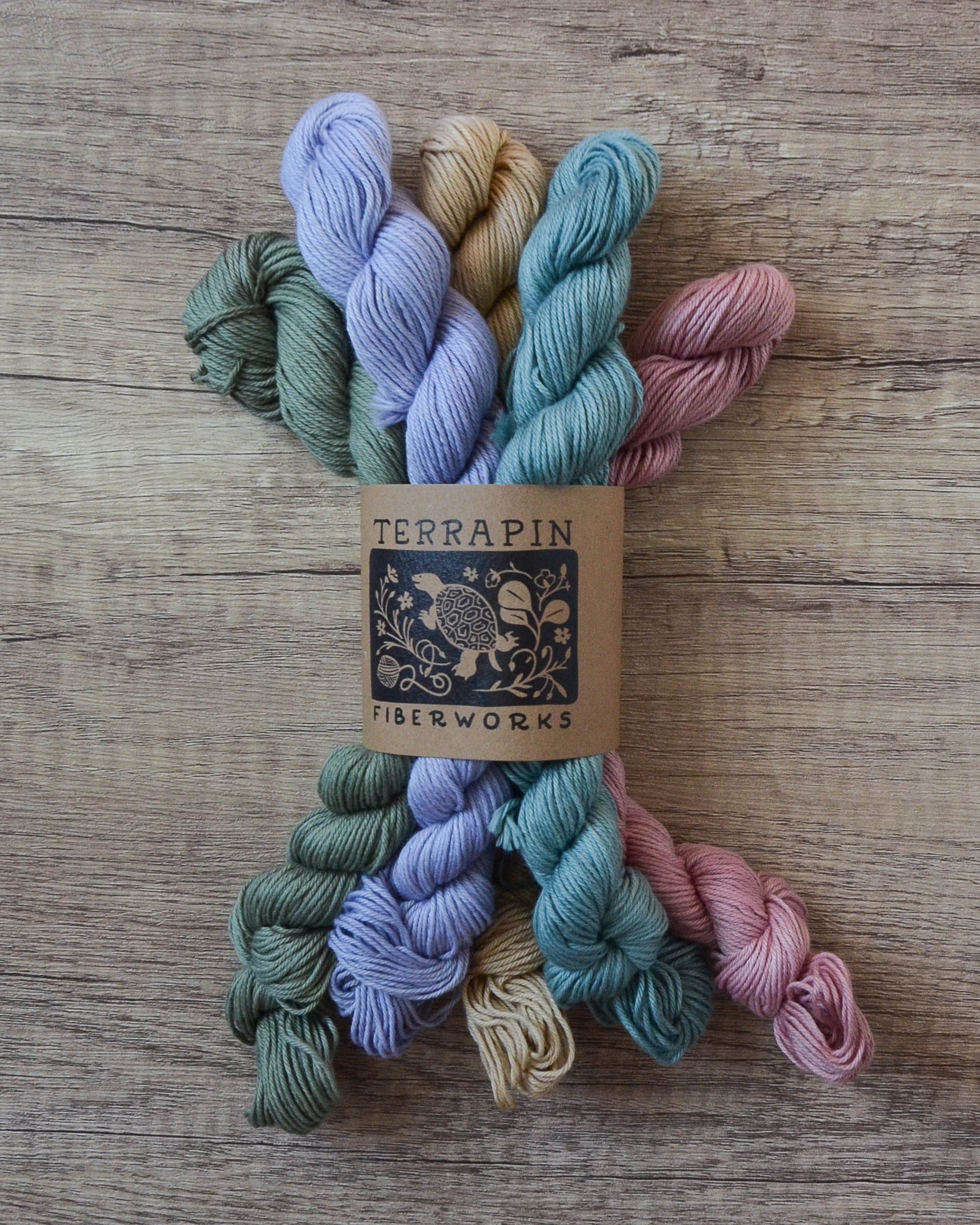 These are 100g sets of 5x20g skeins. The base is Chesapeake Organic Cotton Fingering, 437 yds/100g. Each mini is 87 yds/20g.