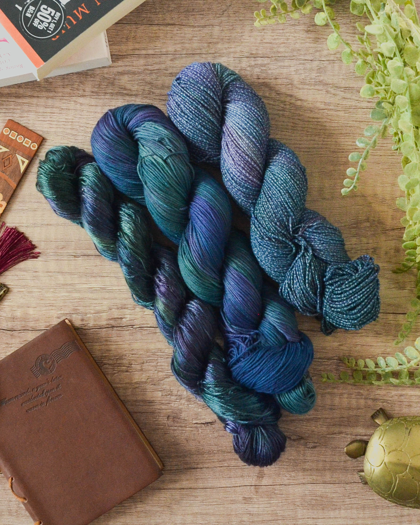 Our October Bookworm color is Eldritch! This is a variegate of deep cobalt, eerie green, and grounding purple.
